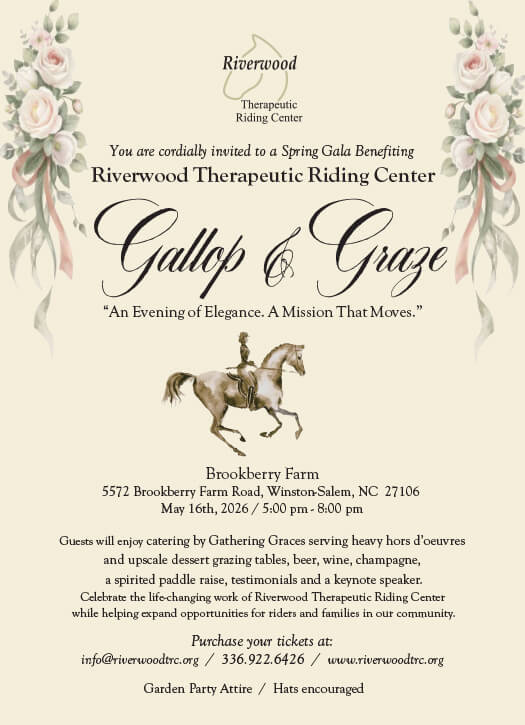 Equine assisted activities help to improve muscle tone, balance, posture, coordination and motor development as well as emotional well-being. Incorporated in 1997, Riverwood is a 501 (c)(3) charitable corporation serving 65 individuals weekly. We are a PATH Intl. (Professional Association of Therapeutic Horsemanship International) Premier Accredited center with nationally certified instructors. Riverwood is located among 53 acres in Tobaccoville, NC and serves Forsyth, Yadkin, Stokes, Surry and Davie Counties.